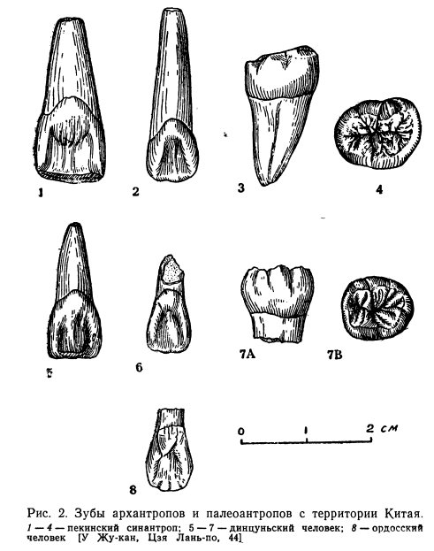 Скудость костных остатков восточноазиатских палеоантропов затрудняет окончательное решение вопроса об их отношении к древним людям других частей ойкумены — неандертальцам и близким к ним неандерталоидным формам. Однако хронологически и морфологически промежуточное положение мабасцев, чанъянцев, динцуньцев и ордосцев между синантропами и современными людьми позволяет выдвинуть гипотезу о существовании на востоке Азии «своих» неандертальцев — потомков местных архантропов. Китайские ученые Пэй Вэнь- чжун, У Жу-кан, Цзя Лань-по и другие считают этих палеоантропов предками современного населения Китая. Для доказательства обычно используются данные о лопатообразной форме резцов, характерной, как мы уже знаем, для архантропов и палеоантропов Восточной Азии, а также для современных монголоидов. Однако указанный аргумент теряет свою убедительность, если учесть, что лопатообразная форма резцов была свойственна древнейшим и древним людям всей первобытной ойкумены [Зубов, 1968, 49–59; его же, 19736, 100–106].