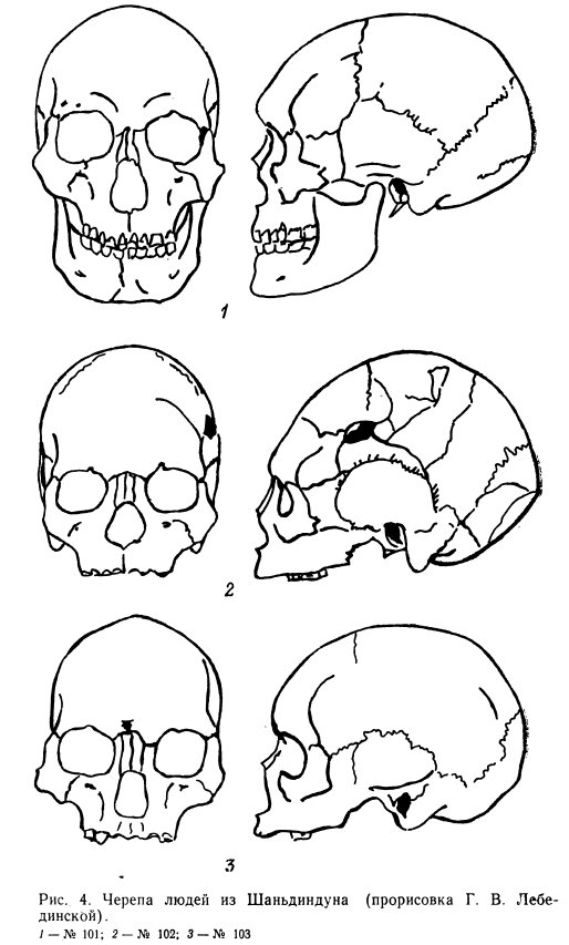 К таким «тихоокеанским» чертам шаньдиндунцев относятся значительная высота мозговой коробки (136–150 мм), альвеолярный прогнатизм и некоторая тенденция к широконосости. ЕСЛИ же учесть большую высоту лица всех шаньдиндунских черепов (69–77 мм), то наиболее близкие аналогии им встречаются только в Восточной Азии и в полярной Америке. Очень возможно, что люди, обитавшие в конце древнего каменного века на севере современного Китая, — предки позднейших популяций, на базе которых складывались восточные, а может быть, и арктические монголоиды.