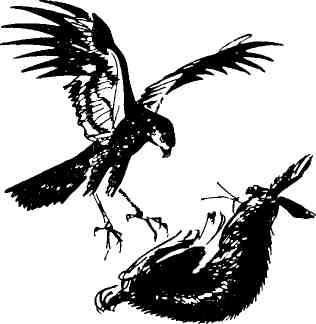 Тяжело махая крыльями, ястреб оторвал зверька от земли и поднял в воздух. Но молодая птица не рассчитала своих сил. Добыча была явно не по ней. Низко над полем хищник потянул к лесу, к тому самому лесу, куда бежал зайчонок.