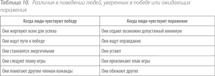 Легко верить в уже состоявшихся людей – победителей любят все. Гораздо труднее верить в людей до того, как они продемонстрируют, на что способны. Но в этом и состоит ключ к мотивации людей. Вам необходимо поверить в них с самого начала, до того, как они добились успеха, и иногда даже до того, как они поверили в себя сами. Никто не может дать веру, если ее нет. Убедить может только убежденный. Некоторые люди в вашей жизни отчаянно хотят поверить в себя, но мало кому это удается. Каждый раз, когда вы вкладываете в людей свою веру, даете им свою поддержку, через некоторое время эти люди захотят больше брать на себя ответственности, расширять свои обязанности, браться за новые проекты. Вера в людей до того, как они состоялись, является ключом к мотивации людей достигнуть своего потенциала. Взгляните, как отличается поведение людей в зависимости от того, уверены ли они в победе или ожидают поражения (таблица 10).