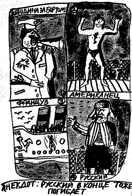 Одним взмахом пластично расстегивает зиппер, срывает шорты и майку, остается в плавках с попугайчиками. Корабль, затаив дыхание, смотрит. Француз подходит к борту, как птица перелетает перила, входит в воду прыжком три с половиной оборота без единого всплеска! Международным батерфляем плывёт спасать женщину, но… не доплыв пяти метров, тонет. Капитан в матюгальник срывающимся голосом: