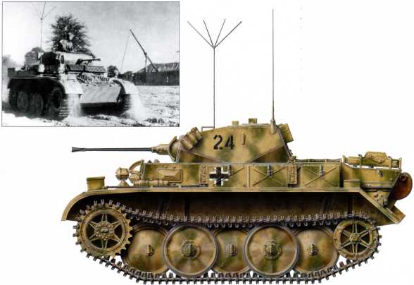 Разведывательный танк Pz.Kpfw.II Ausf.L «Лухс», принадлежащий 4-му разведбатальону 4-й танковой дивизии. На башне машины нанесен тактический номер «24», сам танк имеет желто- зеленый камуфляж. Этот «Лухс», как и другие ему подобные машины на советско-германском фронте оснащен специальным допоборудованием: особым бронелистом и отсекателем осколков в передней части бронекорпуса. Осень 1943 года.