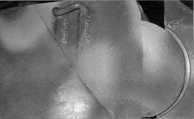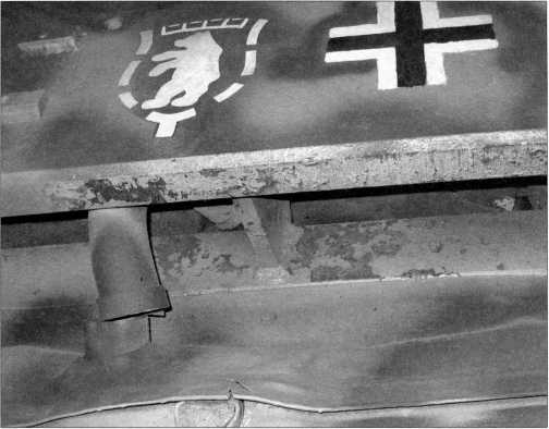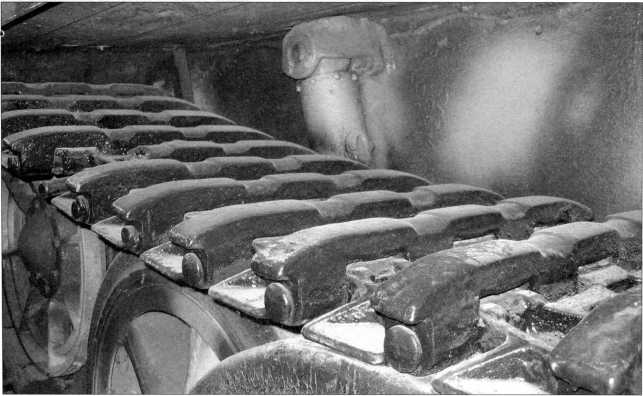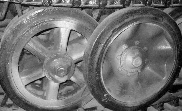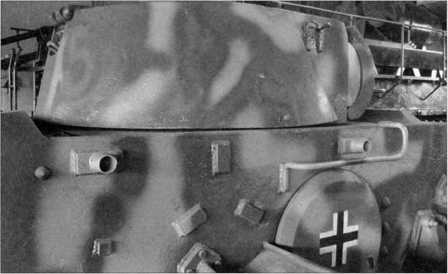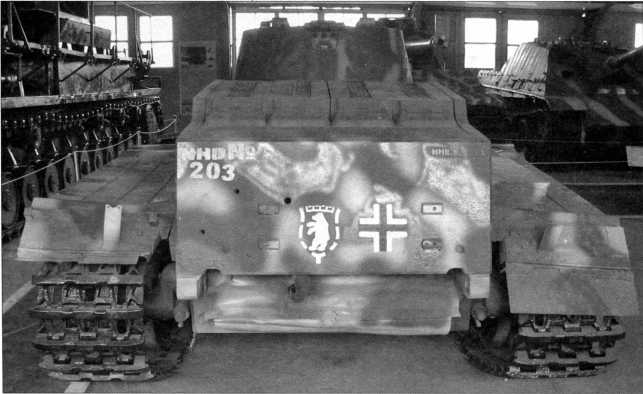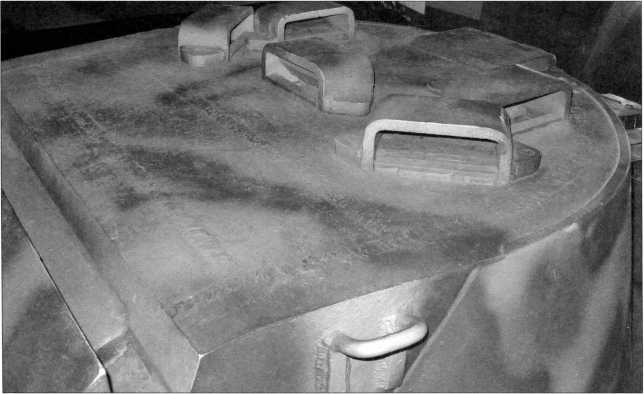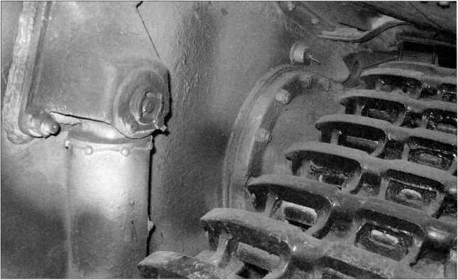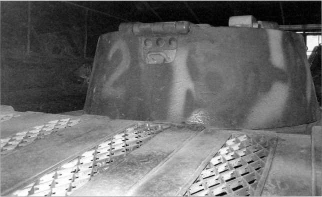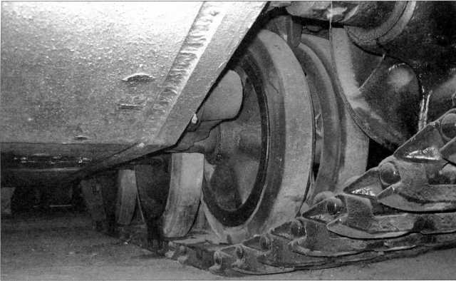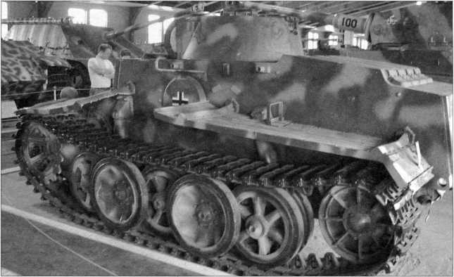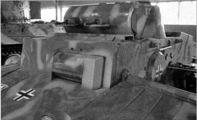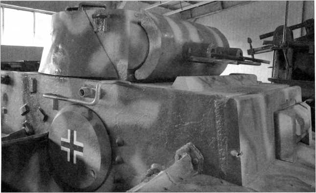 Вид танка поддержки пехоты Pz.Kpfw.l Ausf.F сзади. Ходовая часть, разработанная по принципиальной схеме инженера Кникампа, напоминала аналогичные конструкции для танков «Тигр» и «Пантера». На фотографиях следующей страницы представлена башня танка Pz.Kpfw.l Ausf.F. Основная конструкция была цилиндрической, но броневой цилиндр имел снаружи «юбку», придававшую башне коническую форму. На крыше башни были смонтированы пять перископических приборов наблюдения. Снимок 2009 года.