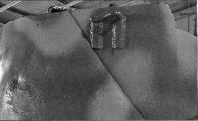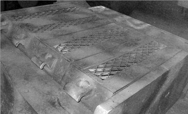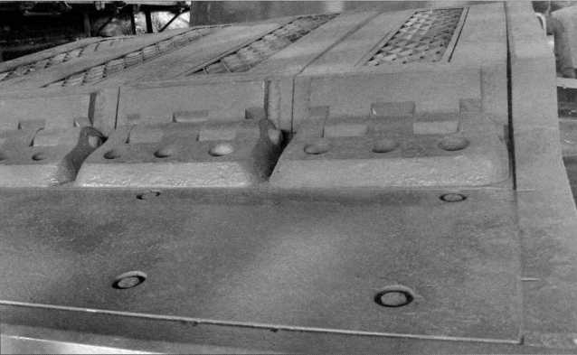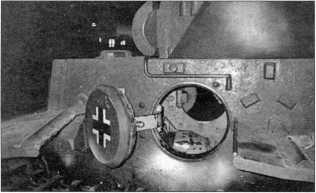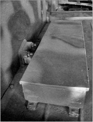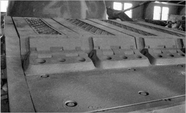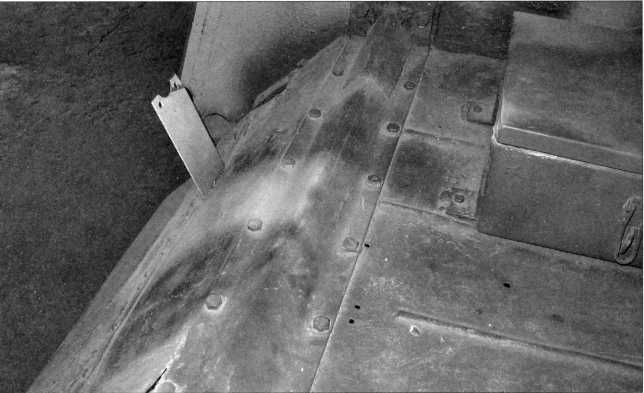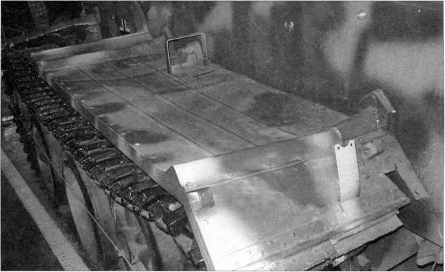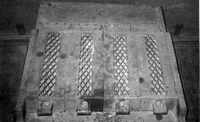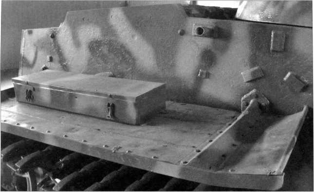 Снимки конструктивного устройства заднего крыла танка Pz.Kpfw.I Ausf.F (там же расположен ящик ЗиП) и надмоторной плиты двигателя «Майбах» HL 45Р. Мощность этого бензинового, карбюраторного, 6-цилиндрового агрегата составляла 150 л.с. Ниже — бортовой люк танка в открытом положении. Фотографии 2009 года.