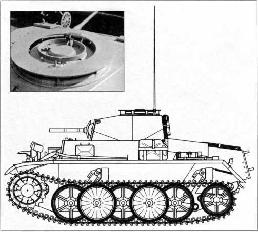 Боковая проекция танка Pz.Kpfw.I Ausf.C (VK 601). Масштаб 1:35. Рядом снимок уцелевшей башни легкого танка Pz.Kpfw.I Ausf.C, находящейся в экспозиции военного музея Белграда.