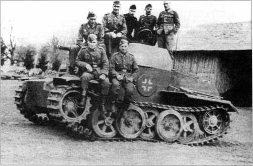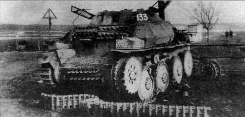 Танк разведки Sd.Kfz.140/1, подбитый во время боев у озера Балатон. Хорошо видно крепление запасных гусеничных танков на лобовом и переднем листах корпуса. Венгрия, февраль 1945 года.