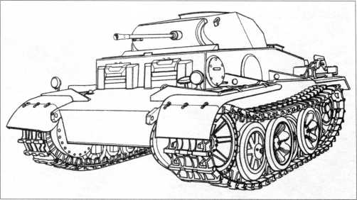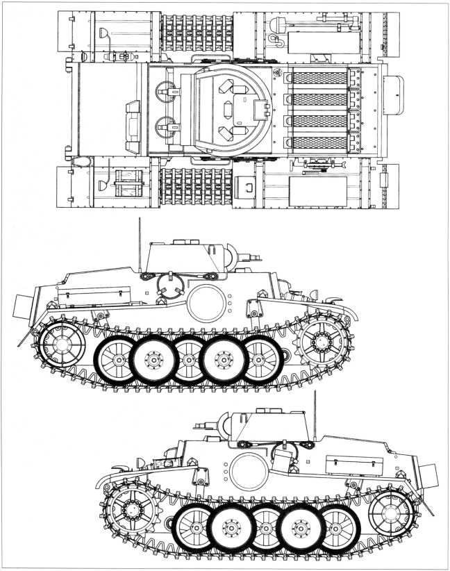 Чертежи танка поддержки пехоты Pz.Kpfw.I Ausf.F (VK 1801). Масштаб 1:35. Корпус и башня танка Pz.Kpfw.l Ausf.F были сварные. Цилиндрическая башня снаружи имела «юбку», придававшую ей коническую форму. На крыше башни было смонтировано пять перископических приборов наблюдения. Два 7,92-мм пулемета MG 34 прикрывались броневыми кожухами.