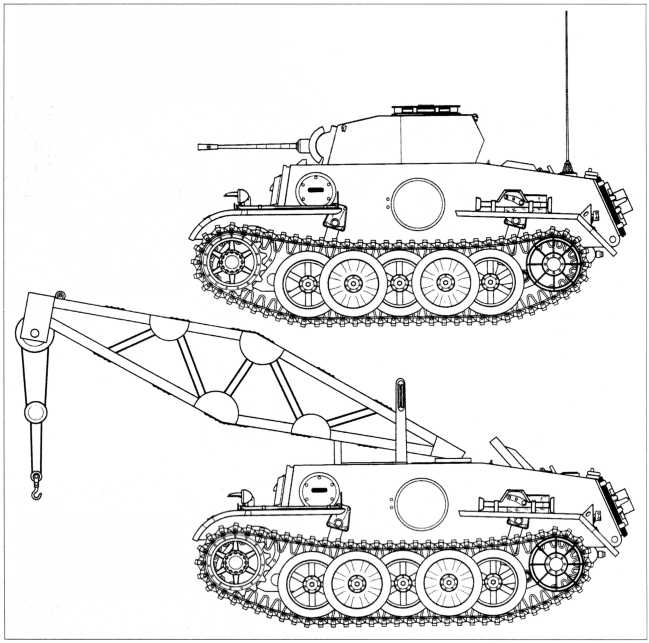 Боковые проекции танка Pz.Kpfw.II Ausf.J, а также ремонтного крана, построенного на его базе. Танк непосредственной поддержки пехоты Pz.Kpfw.II Ausf.J был выпущен малой серией в 30 экземпляров. Судя по фотографиям, радиостанции устанавливались не на всех машинах, к тому же на танках этого типа монтировали различное радиооборудование. БРЭМ Bergerpanzer VK 1601 была создана в единственном экземпляре и эксплуатировалась в 116 тд вермахта.