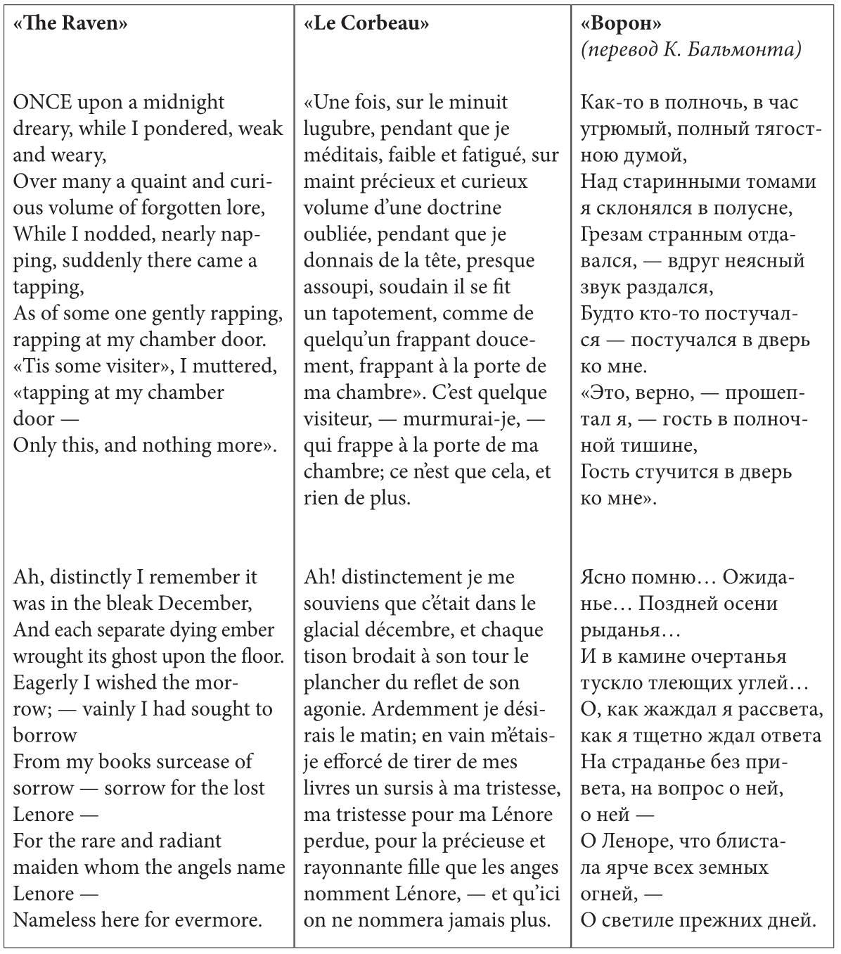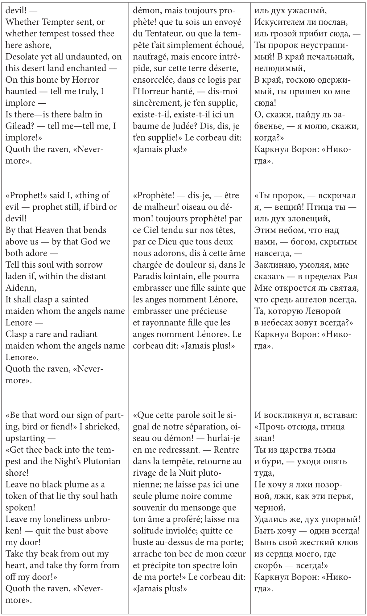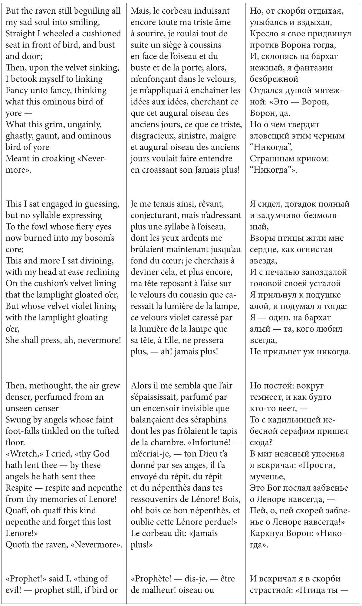 Согласно классификации Х. Ван Горпа 534 , перевод Бодлера стоит отнести к категории добавления наряду с эксплицитным или информативным переводом: «вид перевода, который стремится обнажить прототекст для иноязычного читателя» 535 . А. Попович называет такой тип перевода, в котором «достоинства и недостатки находятся в равновесии, псевдопереводом» 536 . По мнению Е. Эткинда, перевод Бодлера следует поставить в один ряд с переводами Мадам де Сталь в книге «О Германии» и отнести к категории перевод-интерпретация, где «перевод сочетается с парафразой и анализом»: «Именно к этому типу восходит перевод Бодлером “Ворона” Эдгара По: проза и комментарий» 537 . В предпринятом анализе мы выражаем несогласие с такими упрощающими суть дела классификациями.