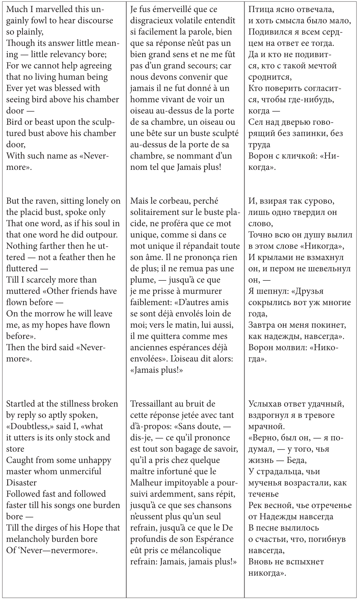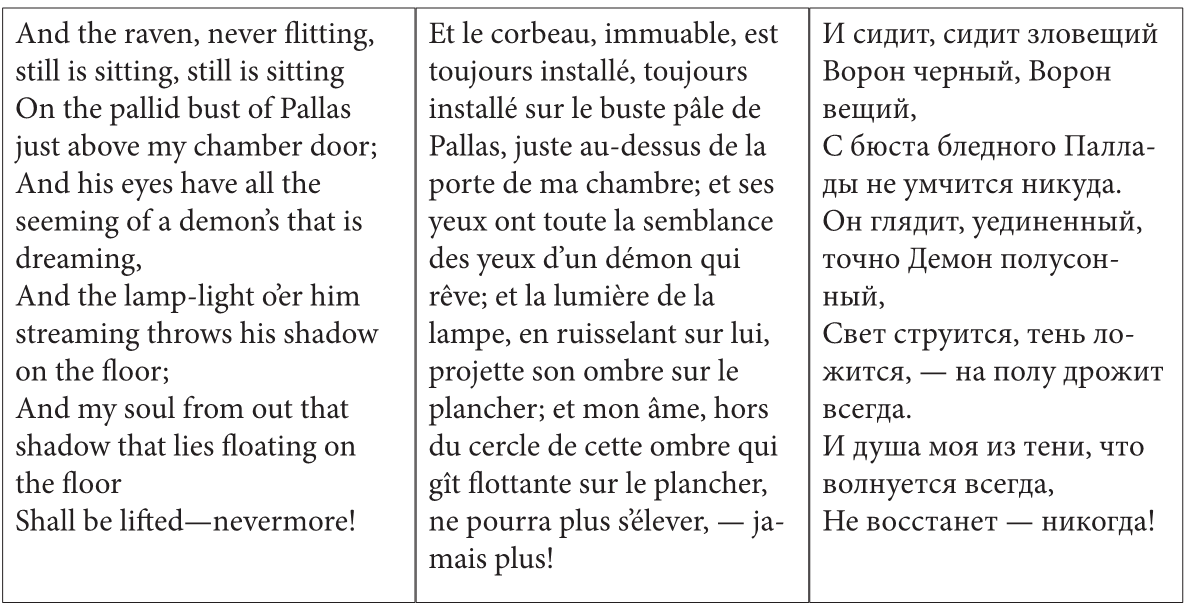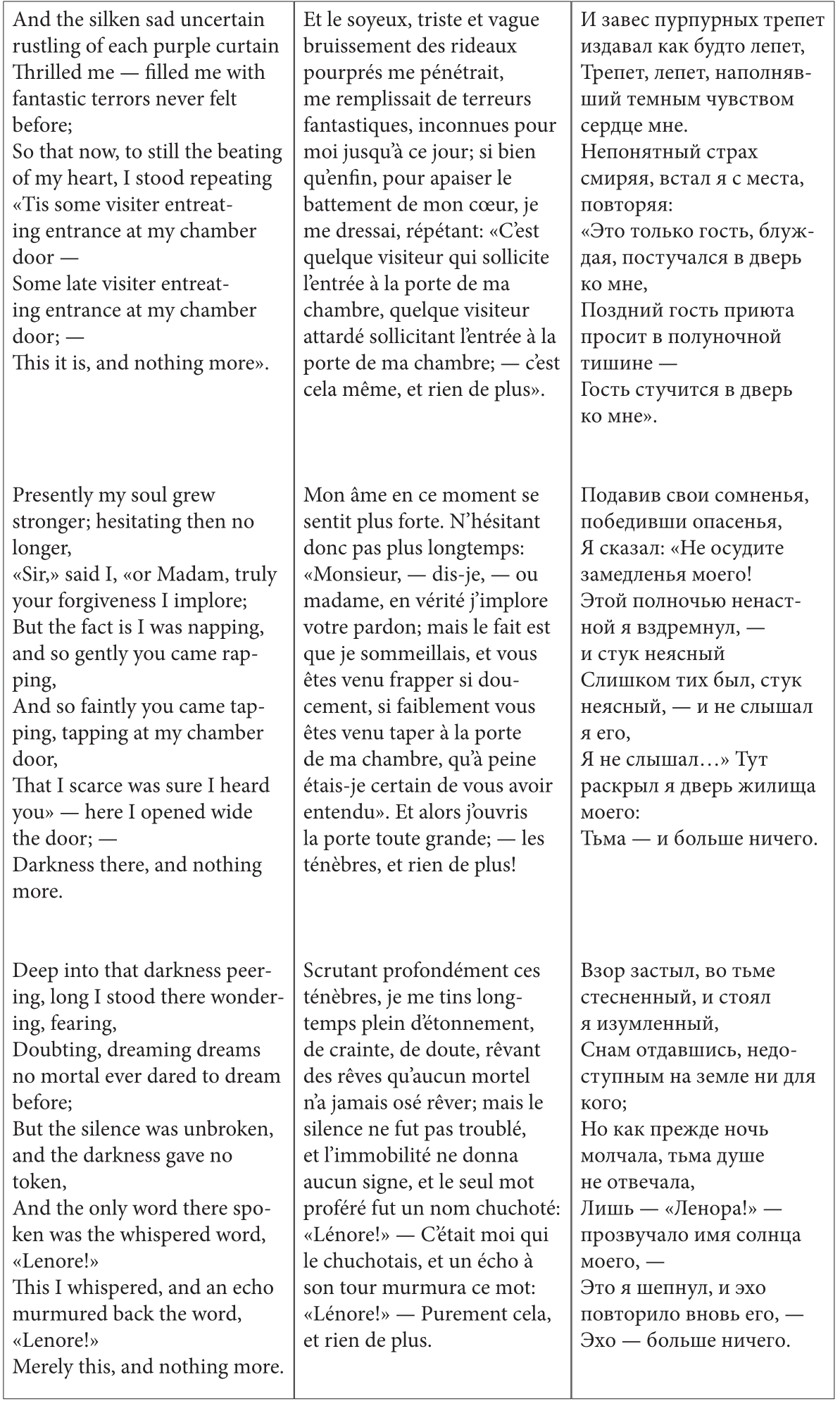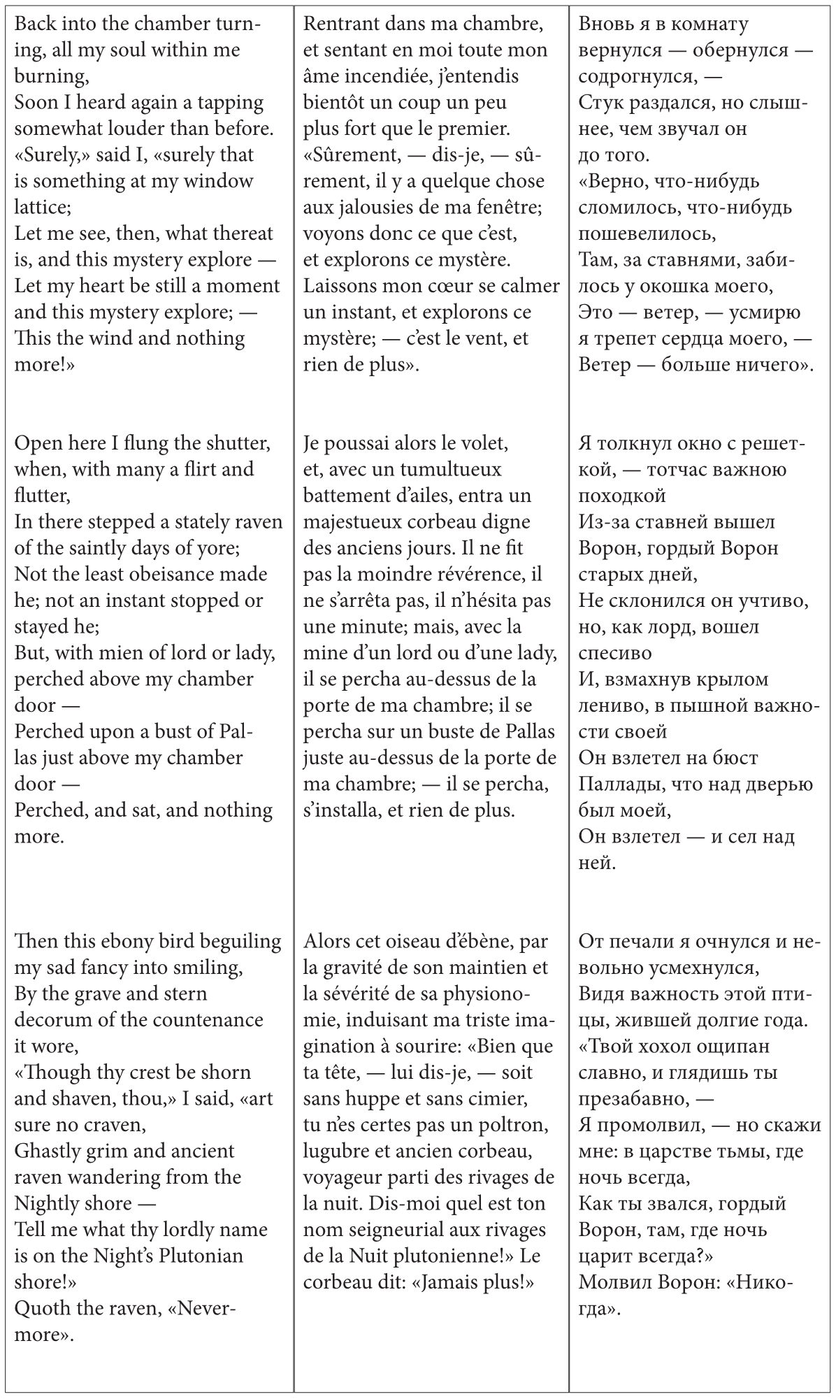 Согласно классификации Х. Ван Горпа 534 , перевод Бодлера стоит отнести к категории добавления наряду с эксплицитным или информативным переводом: «вид перевода, который стремится обнажить прототекст для иноязычного читателя» 535 . А. Попович называет такой тип перевода, в котором «достоинства и недостатки находятся в равновесии, псевдопереводом» 536 . По мнению Е. Эткинда, перевод Бодлера следует поставить в один ряд с переводами Мадам де Сталь в книге «О Германии» и отнести к категории перевод-интерпретация, где «перевод сочетается с парафразой и анализом»: «Именно к этому типу восходит перевод Бодлером “Ворона” Эдгара По: проза и комментарий» 537 . В предпринятом анализе мы выражаем несогласие с такими упрощающими суть дела классификациями.