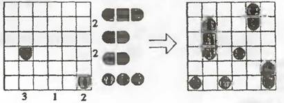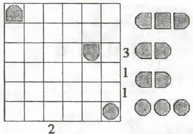 В начальном расположении комплекта кораблей для морского боя не допускается их касание даже по диагонали. Восстановите позицию для игры, если числа справа и снизу показывают количество закрашенных квадратов в соответствующих строках или столбцах (см. также пример).