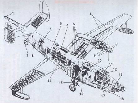 1. Поисковый магнитометр АПМ-60 2. Турбогенераторная установка АИ-8 3. Кабина радиста 4. Палубный люк грузового отсека 5. Крыльевые топливные баки 6. Топливные баки- отсеки 7. Хвостовое колесо 8. Крышка контейнера спасательной лодки 9. Турбовинтовой двигатель АИ-20Д 10. Лодочный топливный бак 11. Аварийные люки летчиков 12. Кабина летчиков 13. Кабина штурманов 14. Противолодочные авиационные торпеды АТ-1 15. Главные ноги шасси 16. Входная дверь 17. Якорный люк 18. Аварийный люк штурмана