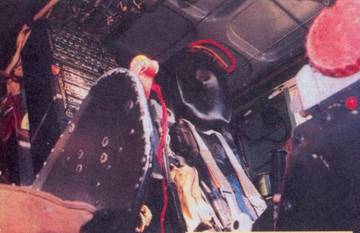 Рабочее место командира корабля, в верхней части заголовника скоба катапультной установки, красная ручка для аварийного отката кресла в заднее положение