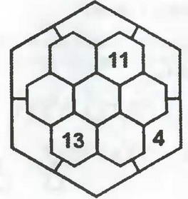 Расставьте числа от 1 до 13 в клетки (каждое число используется один раз), так чтобы в клетках, имеющих общую сторону, числа отличались, по крайней мере, на 3. Некоторые числа уже проставлены.
