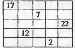 Впишите в квадрат 5x5 числа от 1 до 25 (каждое число используется строго один раз), так чтобы сумма чисел любого вертикального и горизонтального рядов, а также двух главных диагоналей была равна 65. Некоторые числа уже проставлены.