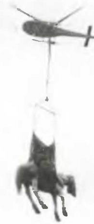 Не каждой лошади удается совершить полет на вертолете. А вот Поки Мари удалось. Правда, это был полет под вертолетом. Зато какое обозрение! Вот только глупые люди зачем-то надели ей на голову мешок. Поки Мари, двадцатилетняя упряжная лошадь, во время поездки прошлой осенью ее хозяина на охоту за лосем повредила заднюю левую ногу в горах Чугач на Аляске. Ей ввели обезболивающее средство и, поместив в сетку, отправили на вертолете домой. Жаль, что лошади не умеют говорить, а то бы хозяин услышал рассказ о совершенном Мари путешествии. Правда, перелет был коротким — всего около пяти километров.