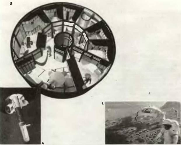 После посадки космонавты останутся в жилом модуле, который превратится для них в крепость. Отсюда на специальном автомобиле с герметической кабиной – «марсоходе» – они станут совершать вылазки в окрестные районы планеты. Первым делом они отправятся на поиски воды, источников энергии и возможных следов жизни. Хотя на поверхности Марса отсутствует всякая органика (см. «Знание – сила», 2000, JNfe 12), на глубине вполне можно найти следы жизни – прошлой или настоящей. В поисках, хлопотах, экспедициях пролетят 550 дней. Космонавты отправятся туда, где вот уже несколько лет их дожидается небольшая ракета, на которой они вернутся на Землю.