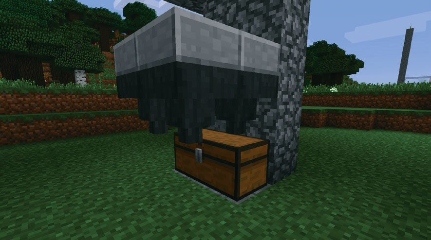 Законченная ферма мобов с закрытой шахтой. Можно использовать стекло в нижней части шахты, чтобы видеть падающих мобов. Когда мобы начнут падать, щелкните правой кнопкой мыши по сундукам, чтобы собрать добычу