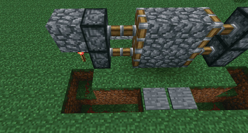 Для создания промежуточной остановки выкопайте яму 2x1 и поместите в нее два блока энергорельсов, также активируемых кнопкой. Вагонетка сможет останавливаться, и вам нужно будет нажать кнопку, чтобы двинуться дальше.