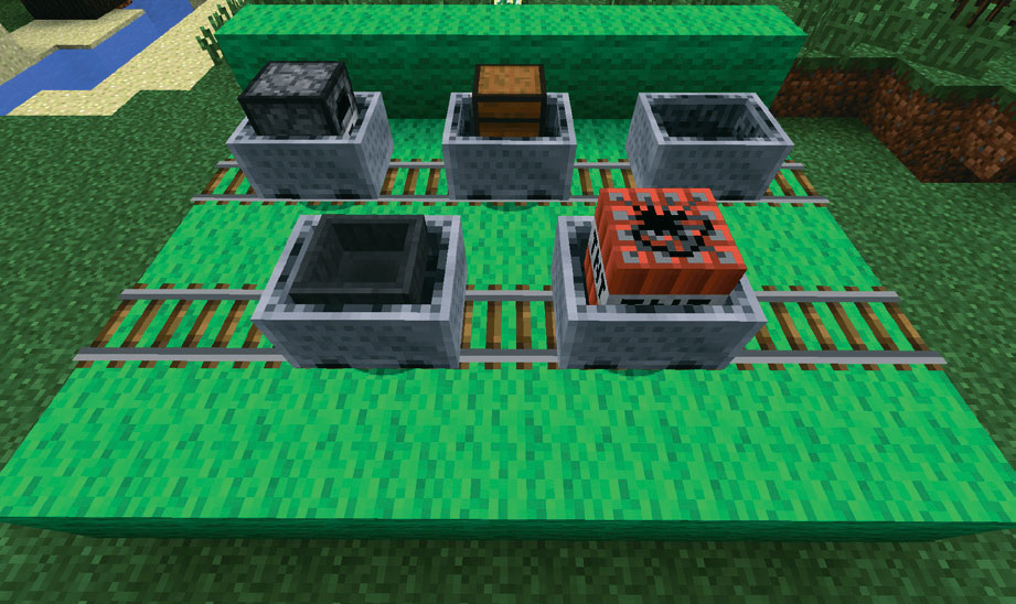 • На перекрестках, где пути пересекают друг друга, но не искривляются, вагонетки всегда поворачивают в направлении нисходящего участка. Если пути прямые во всех направлениях, то вагонетка повернет либо на юг, либо на восток.