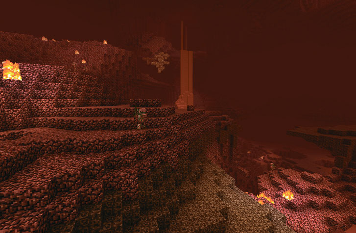 Ландшафт нижнего мира: столбы и моря лавы, парящие острова из адского камня, ревущий огонь и множество враждебных мобов