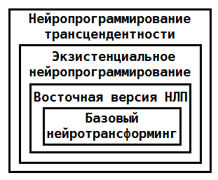 Интегральное нейропрограммирование как раз и состоит из вышеупомянутых четырех блоков психотехнологий, базового нейротрансформинга Восточной версии НЛП/NLP, экзистенциального нейропрограммирования и нейропрограммирования трансцендентности. Эту структуру тоже можно выразить этакой матрешкой: