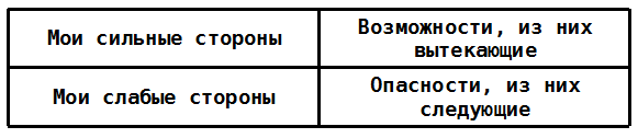 Сделать это не очень-то и сложно, если воспользоваться так называемым методом SWOT-анализа по следующей матрице: