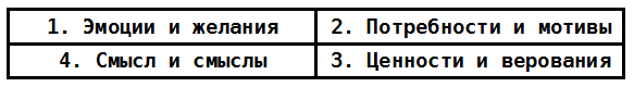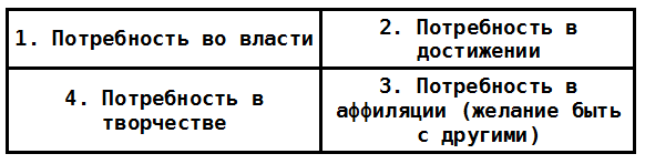 Правда более «научно» (в данном случае — с точки зрения теории трех мотивационных факторов Д. Макклелланда, дополненной четвертым фактором, объединяющим их), ведущие потребности человека в контексте (или в свете) четырех уровней его жизни выглядят так: