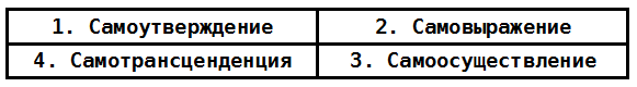 Во-вторых, сия странная мотивация обусловлена некоей центральной темой, проходящей красной нитью через поведение и деятельность человека на каждой стадии/уровне: самоутверждение на первой, самовыражение на второй, самоосуществление на третьей и самотрансценденция на четвертой.