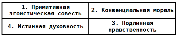 Наконец, в-третьих (больше я не буду строить данные сущностные различия «сверх меры» (Оккам), а только лишь сообщу кое-что дополнительное, но важное), этическими регуляторами жизнедеятельности человека на каждом из уровней выступают совершенно разные этические же ипостаси. Примитивная совесть на первом уровне (та самая, довольно низкопробная, функция которой по Б. Хеллингеру [9] заключается в примитивном контроле за пребыванием в своей группе: не важно, чиновников или бандитов, потому что и тем и другим совестно не перед вами, а только лишь перед своими, а с чужими можно быть абсолютно бессовестным…). Конвенциальная (соглашательская) мораль — на втором (этакое «ты мне — я тебе», «ты меня уважаешь — я тебя буду уважать» и т. п.). Подлинная нравственность — на третьем уровне (предполагающая абсолютную самоценность другого человека и его изначальное равенство тебе…). И истинная духовность — на четвертом (заставляющее на все и вся смотреть через призму или в контексте Божьего замысла и его безграничной любви к своим неразумным чадам…).
