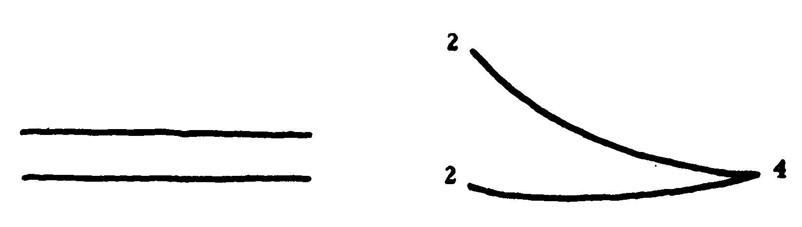 Второй набросок представляет собой вычисление: 2+2=4. Две линии сходятся в одной точке. Точка — это два различных состояния, 2 и 2, которые сведены вместе в одно состояние — 4. Что-то происходит. Вы можете пройти только одним путем. Из отправной точки — то есть состояний 2 и 2 — вы можете дойти до 4. Но если вы уже находитесь там, вы не сможете вернуться обратно, даже если вам известно, что вы перешли от двух состояний к одному, вам известному. 4 может быть выведено из многих других состояний, хотя здесь их показано всего два: 1+3 или 213–209 или -2+6.