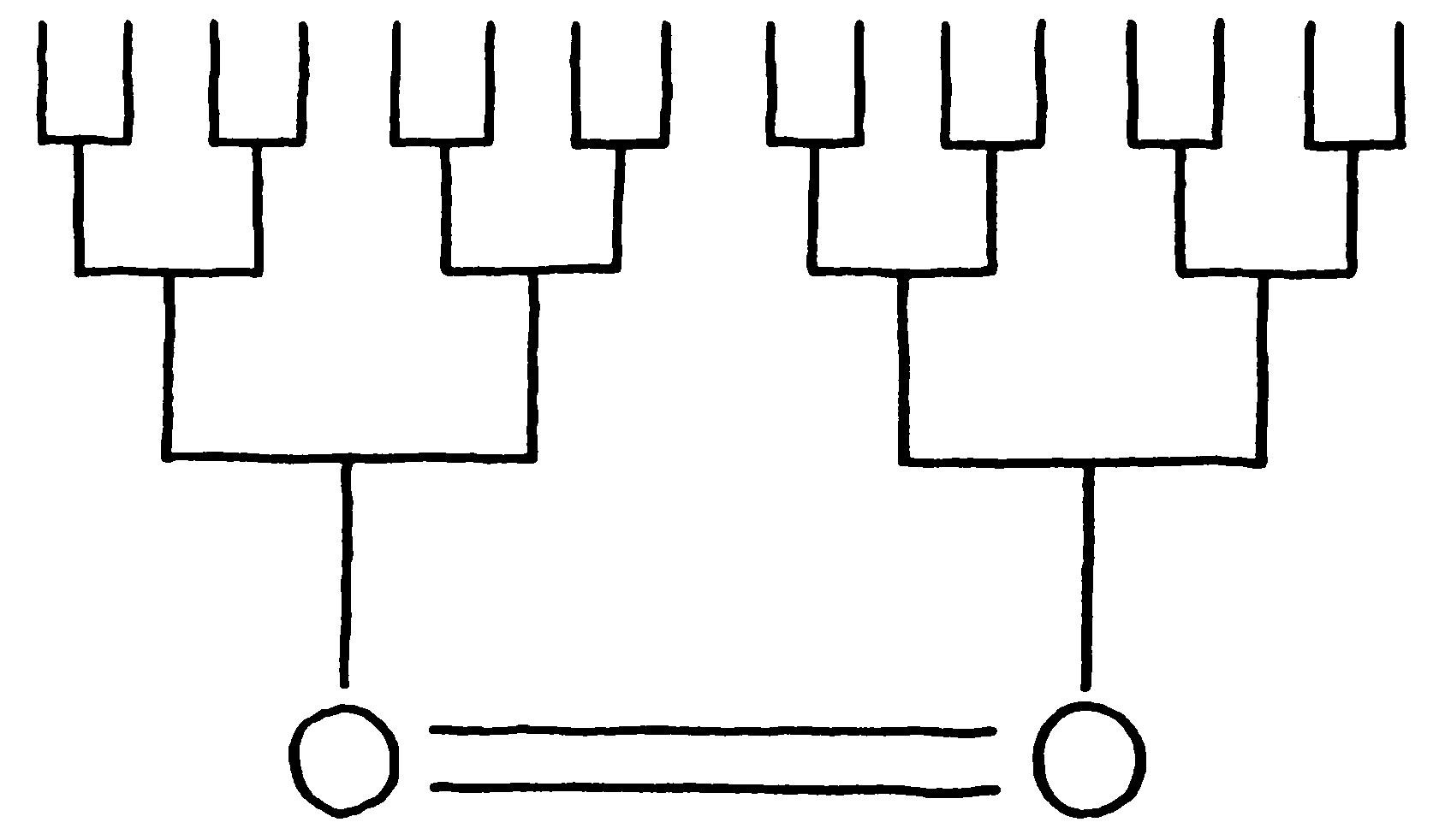 Мы объединим деревья и трубки в наброске, который базируется на стандартной концепции математической теории информации, но специально предназначенном для того, чтобы дать нам представление и об эксформации. Это карта того, как люди говорят друг с другом. Давайте назовем ее «деревом разговора».