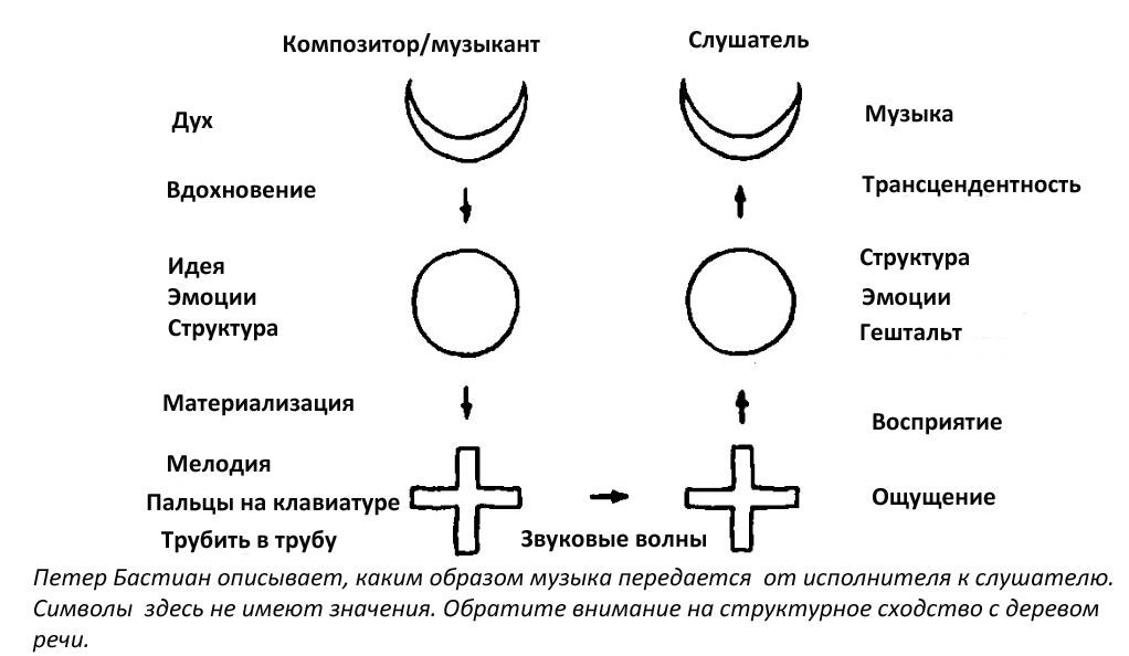 Эта модель не ограничивается только письменной и устной речью. Изначально она была вдохновлена тем, как датский музыкант описывал, что происходит, когда мы слушаем музыку. В своей книге «Ind i musikkin» Петер Бастиан описывает, как композитор преобразует нечто духовное/интеллектуальное в музыку, которую можно сыграть пальцами по клавиатуре. Это вызывает звуковые волны, которые в ухе слушателя улавливаются, осознаются и превращаются в музыку.