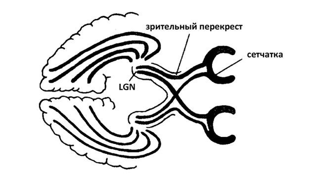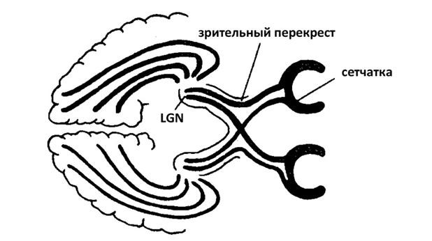 Информация от сетчатки проходит через LGNв таламус перед тем, как достичь зрительных центров мозга, которые находятся в задней части головы.