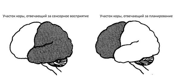 Отделы мозга по Лурия: весь мозг покрывает кора. Таламус и несколько других жизненно важных центров находятся глубоко в мозгу. Кора делится на задний отдел, который в основном обрабатывает сенсорную информацию, и на переднюю часть, которая имеет дело с планами и идеями.