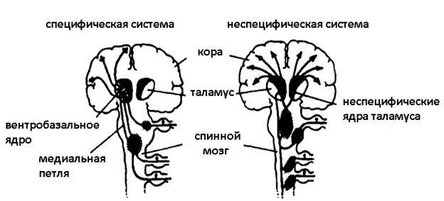 Специфическая и неспецифическая нервная система. Специфическая нервная система соединяет определенные части тела с определенными частями коры головного мозга. На своем пути эта система проходит через область таламуса, известную как вентробазальное ядро. Неспецифическая система собирает информацию со всего организма в таламус, который подает эту информацию на весь церебральный кортекс.