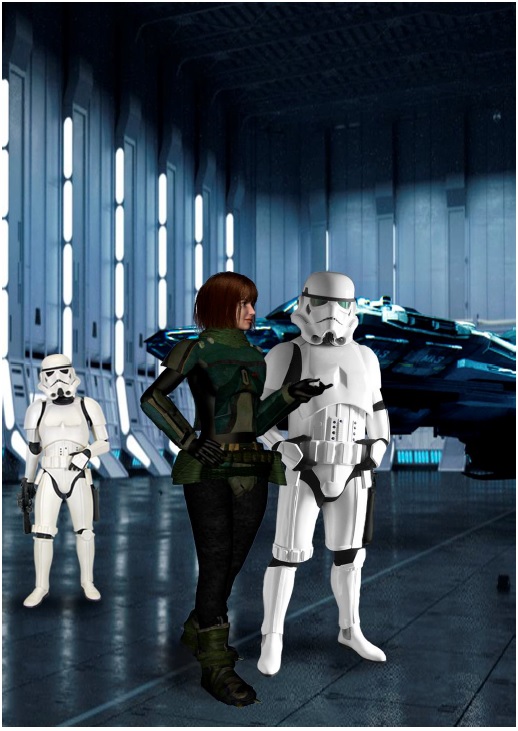 Контр-адмирал и полковник приблизились к моффу, представились. Тот задал несколько вопросов, затем отдал какое-то распоряжение. Адъютант поднёс к губам комлинк. И буквально через десять секунд из "коробки" выстроенных чуть в стороне офицеров трусцой выскочил майор Шевв. Мофф, тем временем, двинулся к выходу во внутренние коридоры и сделал ему знак "следуйте за мной". Позеленев, Шевв потрусил в кильватере Таркина. Похоже, кое-какие грешки он за собой чувствовал и ожидал серьёзных неприятностей. По другую руку от моффа двигалось существо в плаще. По размашистой, но плавной походке было понятно, что личный представитель лорда Вейдера – женщина, притом нестарая. Интересно, какого вида? Имперский антропоцентризм каким-то волшебным образом не распространялся на высшую номенклатуру, хуманы при Императоре и Лорде служили с тем же успехом, что представители базовой линии человечества. А женщины – с тем же успехом, что мужчины.