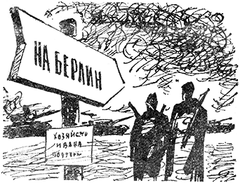 Регулировщикам трудно: на шоссе — беспрерывное движение — грозно громыхая гусеницами, проходят самоходные пушки; подняв кверху круглые чаши закрытых брезентом рефлекторов, медленно двигаются прожекторные установки; точно метеоры, на «виллисах» и мотоциклах проносятся офицеры связи; низко урча, ползут тяжело нагруженные боеприпасами «зисы», «студебеккеры», «доджи». Все это, словно могучий, неотвратимый поток, движется по направлению, указанному белой стрелкой с надписью: «Берлин».