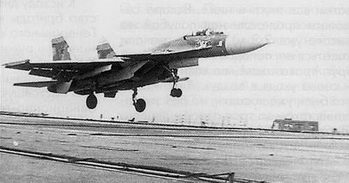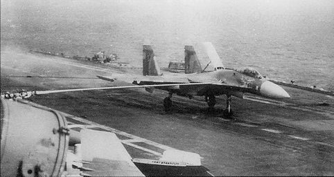 Первые заходы Су-27К на посадку на ТАКР "Тбилиси" с пробежкой по палубе и уходом на второй круг