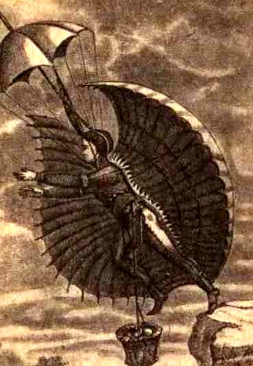 Полтораста лет тому назад появился фантастический роман. Автор романа, французский писатель Ретиф де-ла-Бретон, описал чудесное путешествие юноши Викториуса. Викториус посетил сказочные страны, в которых жили всевозможные чудовища: люди-слоны, люди-птицы и другие. Собираясь летать, Викториус и его друзья надевали зонты с крыльями. Зонты поддерживали юношей в воздухе, а передвигая крыльями, как птицы, они летели, куда им хотелось.