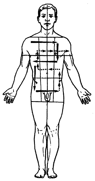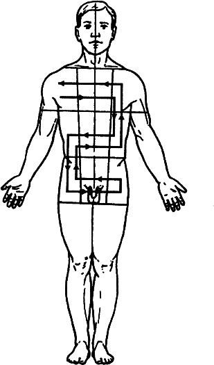 Порядок прохождения лепестков такой. Начинаем справа сверху (1) – правое плечо, правый плечевой сустав, верхушка легкого, затем переходим на середину (2) – бронхи, щитовидная железа, лицо; далее переходим левее (3) – левое плечо, плечевой сустав, верхушка левого легкого; затем переходим ниже (4) – средняя часть живота слева и т. д. по порядку номеров (1–9 см. рис. 27). Возвращаемся тем же путем.