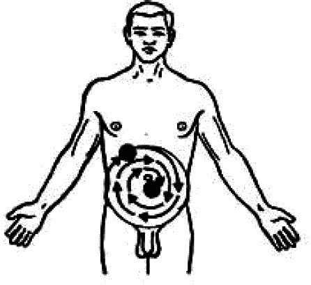В любом случае ощущения перемещаем только по часовой стрелке, по ходу кишечника. Единственная область, где допускается вращение против часовой стрелки, – околопупочная; особенно это действенно при пониженном тонусе кишечника.