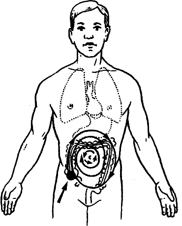 Лучше всего начать с правой подвздошной области (рис. 30), где начинается толстый кишечник. Можно начать и с области пупка, то есть с середины живота, если сначала работать с тонким кишечником.