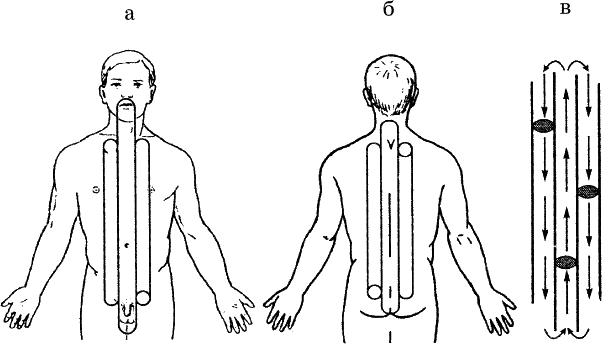 Далее вновь начинаем с левой ладони. Поднимаемся вверх до подмышечной области, переходим на спину (рис. 39б), проходя ее также по дуге (но не останавливаясь), идем в правую подмышечную область, затем по внутренней поверхности правой руки спускаемся к ладони, захватывая лишь безымянный палец и мизинец. После этого тем же путем возвращаемся назад – к левой ладони.