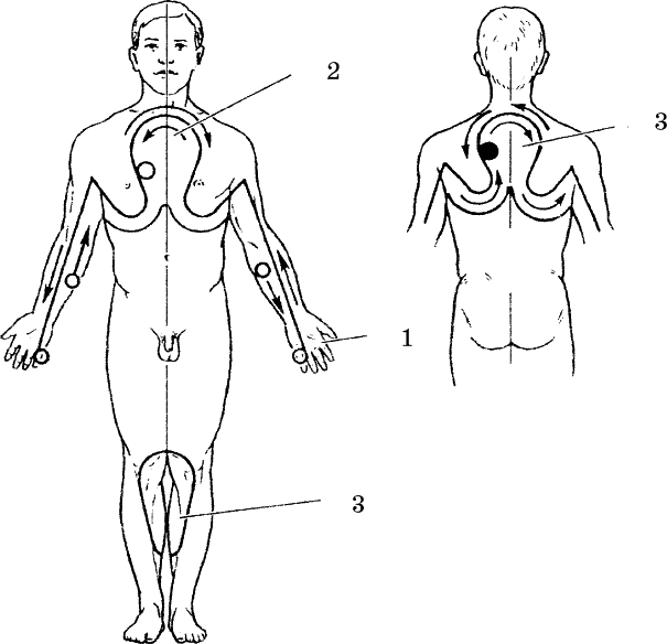 Начинаем с левой ладони: захватывая лишь два пальца – мизинец и безымянный, поднимаемся вверх по внутренней стороне руки до подмышечной области, затем по дуге идем к середине корпуса в точку (3) у основания грудины.