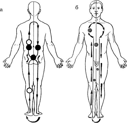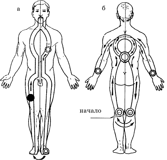 Поднимаемся по наружной поверхности ноги, переходим на заднюю поверхность бедра и оттуда к копчику (4) (рис. 46б), там усиливаем ощущение до максимума и идем вперед (насквозь), переходя на переднюю поверхность в область (1) – «Дом старой девы».