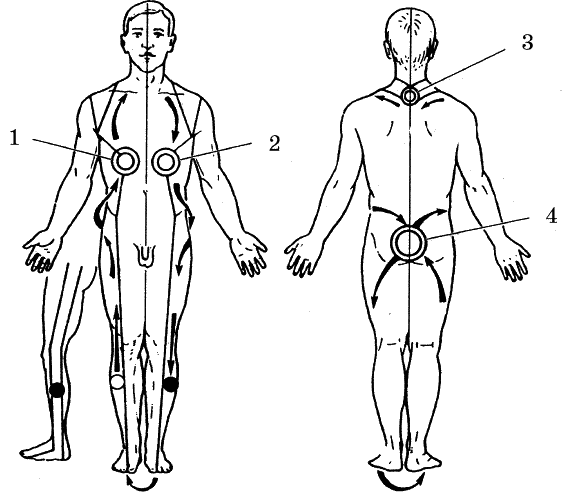 Вот как об этом сказано в древнем Каноне: «Приходи в гости и согрей душевной теплотой дом старой девы. Если она держит за пазухой камень, сделай так, чтобы она выбросила его». То есть в (1) делается небольшая остановка (с максимальным усилением ощущения), затем переход (как показано на рис. 46) на спину в (3) («Дом отца»), в нем остановка; далее переход через плечо на переднюю поверхность в (2) («Дом трусливого обжоры»), там остановка и усиление ощущения до максимума.