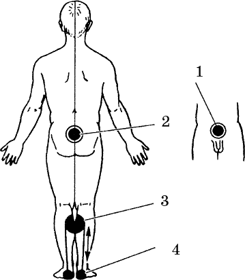 Делаем небольшую остановку на 2–3 секунды и одновременно усиливаем ощущения. Затем работаем с «лепестком» слева – аналогично и симметрично правому, затем вновь усиливаем ощущения и делаем небольшую остановку (4). После этого идем вниз к мочевому пузырю (3), слегка отклоняясь вбок. Далее спускаемся по левой ноге так же, как поднимались по правой ноге. Это один проход. Таких проходов делаем по одному на каждое ощущение. Начинать можно с любой ноги.