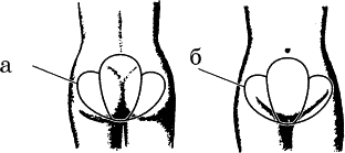 В области, лежащей чуть выше тазобедренных суставов в глубине (рис. 50а и б) – справа или слева – усиливаем ощущения до разумного максимума, одновременно удерживая его в течение 8–10 секунд.