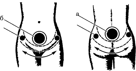 После этого перемещаем в противоположную сторону в область (а) или (б), аналогично удерживая там, затем вновь возвращаемся в область (в) за мочевым пузырем. Это один проход, такие проходы делаем 5–6 раз.